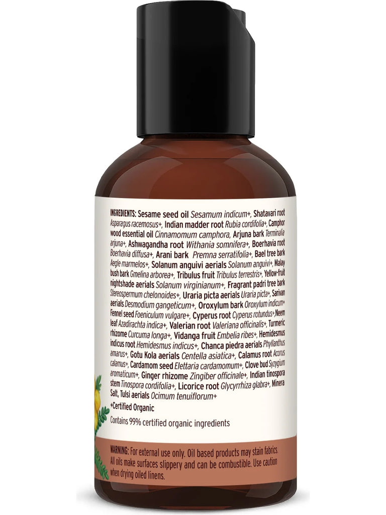 Sesame oil**, Dashamula**, Shatavari (Asparagus racemosus )**, Camphor Oil, Manjista (Rubia cordifolia )**, Arjuna (Terminalia arjuna )**, Ashwagandha (Withania somnifera)**, Bala (S crdfa )**, Punarnava (Boerhaavia diffusa)**, Fennel (Foeniculum vulgare )**, Musta (Cyperus rotundus)**, Neem (Azadirachta indica)**, V offic )**, Turmeric (Curcuma longa )**, Vidanga (Embelia ribes)**, Anantamul (Hemidesmus indicus)**, Bhumyamalaki (Phyllanthus fraternus)**, Brahmi (Centella asiatica)**, Calamus (Acorus calamus)**, Cardamom (Elettaria cardamomum)**, Clove (Caryophyllus aromaticus)**, Ginger (Zingiber officinale)**, Guduchi (Tinospora cordifolia)**, Licorice (Glycyrrhiza glabra)**, Mineral Salt, Tulsi (Ocimum sanctum)**.