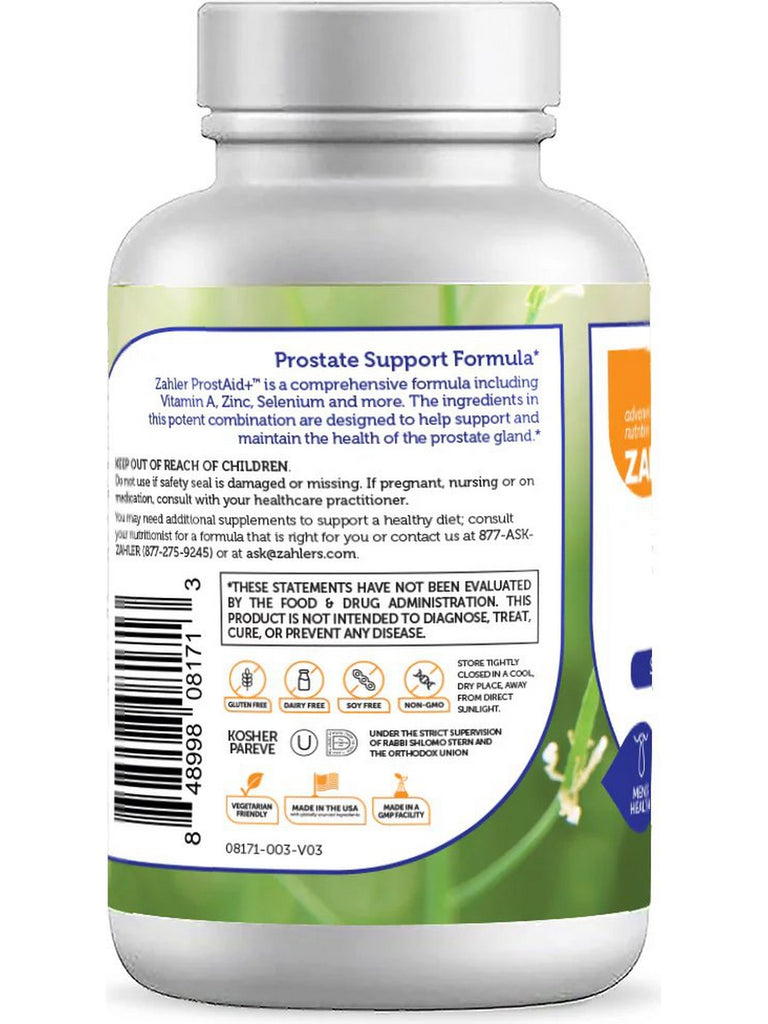 Zahler ProstAid+ is a comprehensive formula including Vitamin A, Zinc, Selenium and more. This potent combination of carefully selected ingredients is designed to help support and maintain the health of the prostate gland. It is especially important for males over the age of 50 to boost and support their prostate health since as men age, the chances of prostate problems increase significantly.