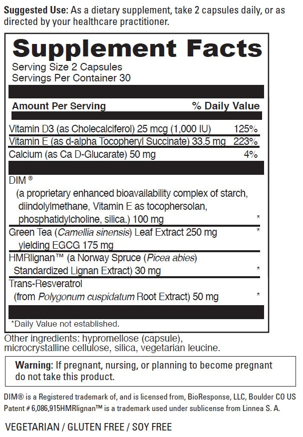 A dietary supplement to support hormonal balance in men and women. Estro Benefits™ is a blend of DIM® combined with Vitamin D3, Vitamin E, Calcium D-Glucarate, Indole-3-Carbinol, Green Tea Extract, HMRlignan™, and Trans-Resveratrol. Estro Benefits is a state of the art formula that supports hormone balance and cellular health in both men and women.