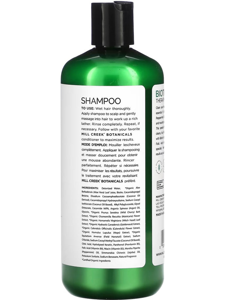 Mill Creek Biotin Shampoo helps replenish important nutrients for healthy scalp and hair. Our therapy formula is combined with Biotin, an essential member of the B-complex family with other B vitamins-Panthenol, Niacin, and Folic Acid. Argan Oil and Organic Aloe Vera create healthy looking hair. Refreshing Peppermint Oil provides an invigorating sensation for the scalp. Great for hair loss/hair growth. Color Safe. pH Balanced.