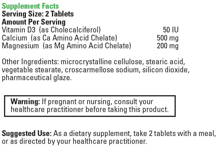 A Calcium/Magnesium/D3 supplement to support bone function. A hydrolyzed protein chelate form of Calcium and Magnesium in a 2:1 ratio, with additional Vitamin D3, this complex is efficiently assimilated by the body.