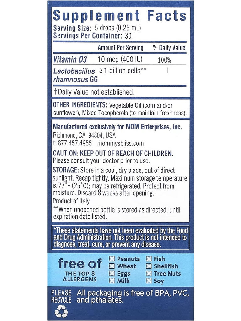 Mommy's Bliss, Baby Probiotic Drops, Everyday Digestion + Vitamin D, 400 IU, Age Newborn +, .34 fl oz