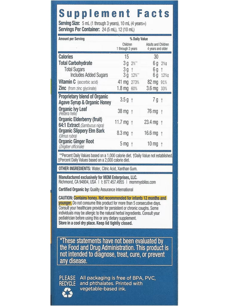Mommy's Bliss, Organic Kids Cough Syrup and Mucus + Immunity Support, Kids 1-12 Yrs, 4 fl oz