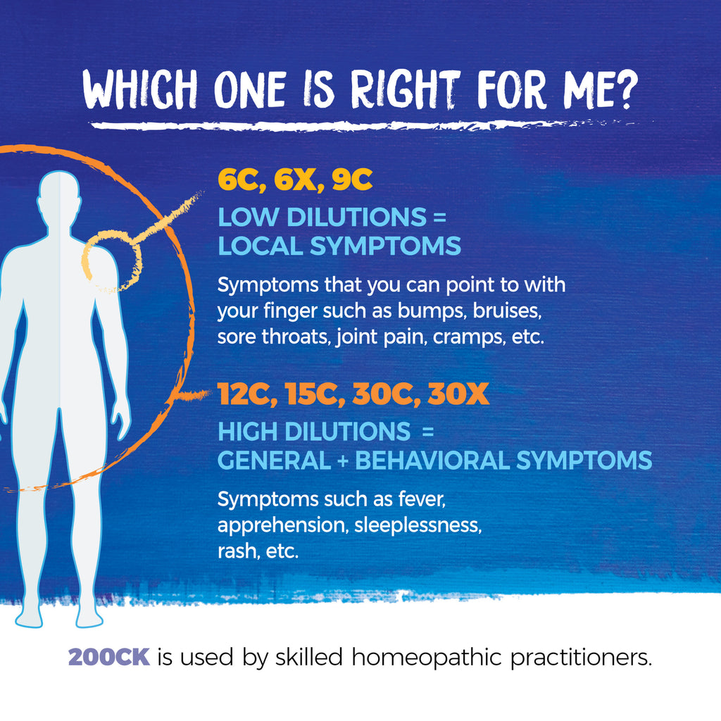 Low dilutions, such as 6X, 6C, or 9C, relieve symptoms you can point to with your finger (e.g., an insect bite or bruise). High dilutions, such as 12C, 15C, or 30C, relieve general symptoms in more than one location (e.g., fever, apprehension, or rash). 200CK is typically recommended by homeopathic practitioners.