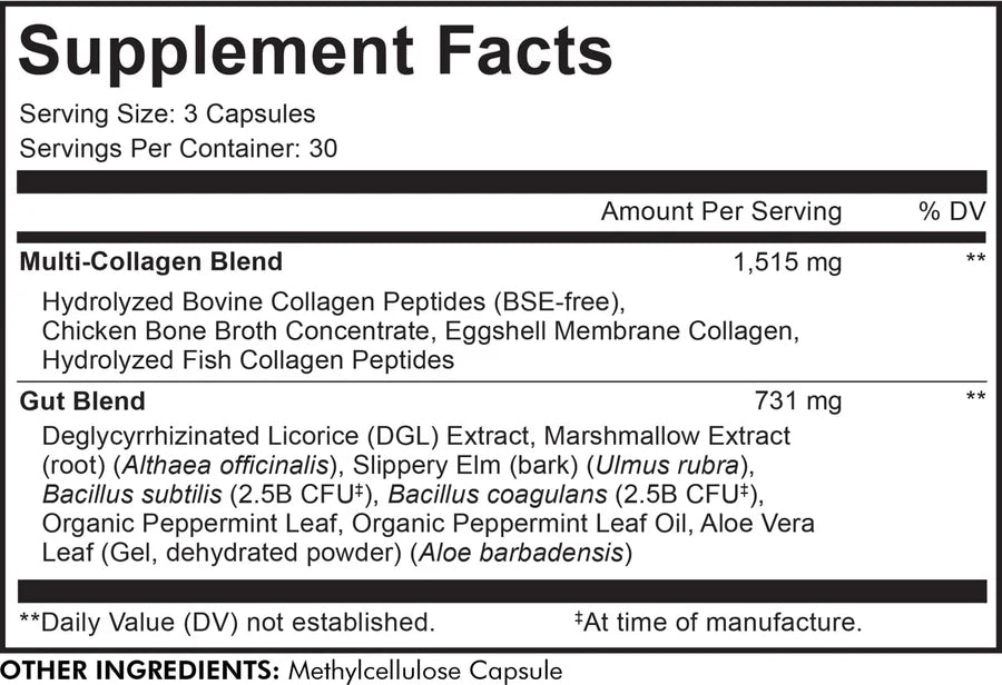 Collagen, probiotics and gut botanicals combined in one digestive supplement blend. This gut health formula features 5 types of collagen with licorice (DGL), marshmallow, slippery elm & other herbs in an all-in-one capsule solution.