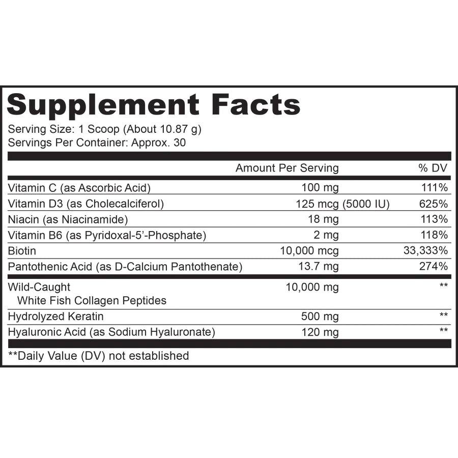 - Features a high level of fish collagen types 1 and 3, biotin 10000 mcg, vitamin C, vitamin D3, vitamin B6, niacin, pantothenic acid, and hydrolyzed keratin all-in-one.