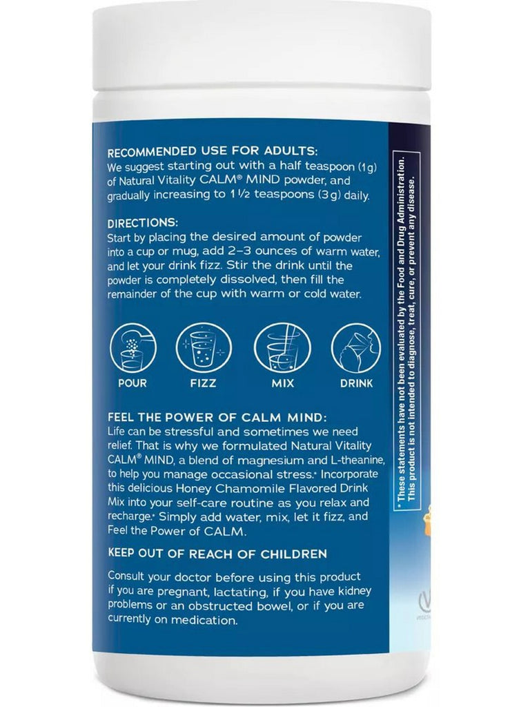 Recommended Use For Adults: We suggest starting out with a half teaspoon (1g) of Natural Vitality Calm Mind powder, and gradually increasing to 1 1/2 teaspoons (3 g) daily. Directions: Start by placing the desired amount of powder into a cup or mug, add 2-3 ounces of warm water, and let your drink fizz. Stir the drink until the powder is completely dissolved, then fill the remainder of the cup with warm or cold water. Pour, fizz, mix, drink.