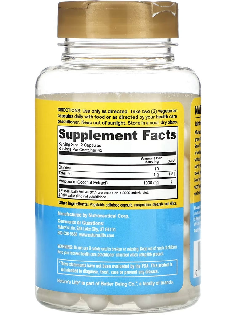 Monolaurin is one of the most powerful nutrients within a mother's breast milk. Sourced from raw coconuts, each serving of Monolaurin provides 1,000 mg of this powerhouse compound. When you choose Nature's Life, your wellness is in good hands.