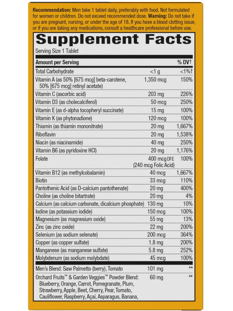 Supercharge your wellness routine with one convenient tablet packed with the good stuff. Alive! Once Daily Men's Ultra Potency is a complete multivitamin formulated to support your go-getting lifestyle with 100% Daily Value of 19 vitamins and minerals and 200% Daily Value of 13 vitamins and minerals, including premium B-vitamins to convert food into cellular energy so you can hit the trails, hang with your family, and feel your best for every moment.
