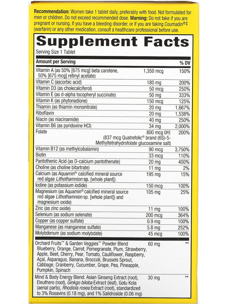 The future looks so bright. Feel energized and alive for every moment with this ultra-potent daily multivitamin formulated specially for women age 50+. It's made with 100% or more of the Daily Value of 19 vitamins and minerals and 200% or more of the Daily Value of 12 vitamins and minerals, including premium B-vitamins to convert food into fuel. This complete formula supports bone health, eye health, heart health, skin health, immune health, and energy metabolism making it a simple way to support your nutrition and health every day.