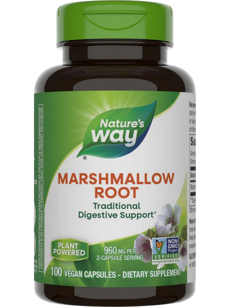 Marshmallow, which is native to Europe, western Asia, and the northeastern region of Africa, has been traditionally used for hundreds of years. (The sweet treat marshmallows are no longer made from the plant.) Marshmallow grows in uncultivated sandy soil, often on the banks of rivers and marshes. The root has been used to make teas, tinctures, and powders. Nature's Way Marshmallow Root is traditionally used to soothe digestion.