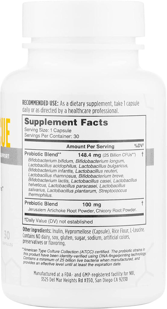 Each capsule provides 25 billion colony forming units (CFU) of probiotics from 15 different species, including nine Lactobacillus species, five Bifidobacterium species plus Streptococcus thermophilus, and 100 mg of prebiotic fiber blend from artichoke and chicory root.