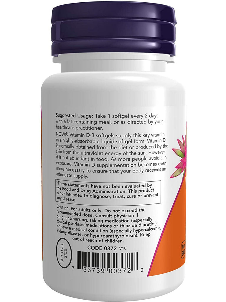 NOW® Vitamin D-3 softgels supply this key vitamin in a highly-absorbable liquid softgel form. Vitamin D is normally obtained from the diet or produced by the skin from the ultraviolet energy of the sun. However, it is not abundant in food. As more people avoid sun exposure, Vitamin D supplementation becomes even more necessary to ensure that your body receives an adequate supply.