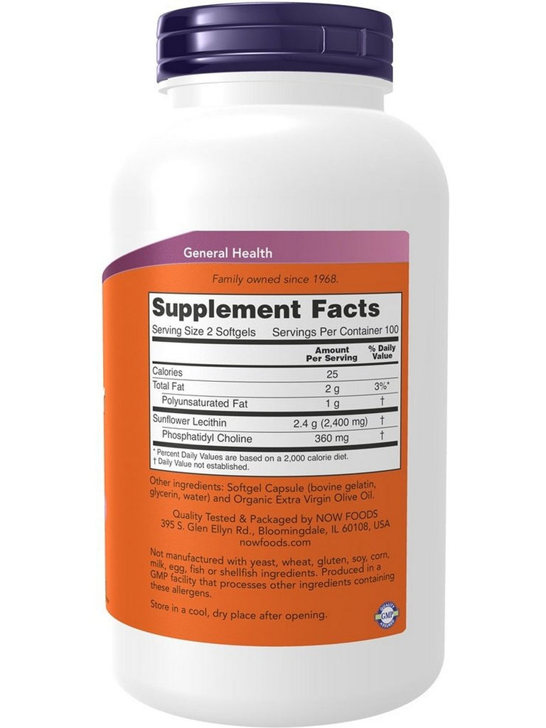 NOW® Sunflower Lecithin has phosphatidyl choline, the most abundant phospholipid in the cell membrane, where it plays a key role in cellular signaling and synaptic function. NOW® Sunflower Lecithin also naturally abounds in phosphatidyl inositol, phosphatidyl ethanolamine, and essential fatty acids. Lecithin in the diet aids in emulsifying fats, enabling them to be dispersed in water; and as a choline-containing phospholipid, its choline is easily absorbed and utilized by the body. NOW® Sunflower Lecithin Softgels are non-GMO and soy-free.