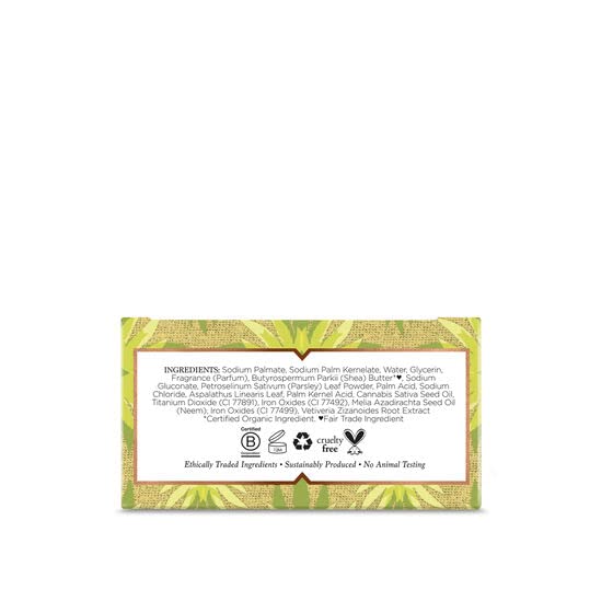 Sodium palmate, sodium palm kernelate, water, glycerin (vegetable), fragrance (parfum), sodium chloride, butryospermum parkii (shea) butter, aspalathus linearis leaf, organic cannabis sativa seed oil, tetrasodium EDTA, yellow 10 (CI 47005), titanium dioxide (CI 77891), iron oxides (CI 77499), melia azadirachta seed oil, red 4 (CI 14700), green 3 (CI 42053), citric acid.