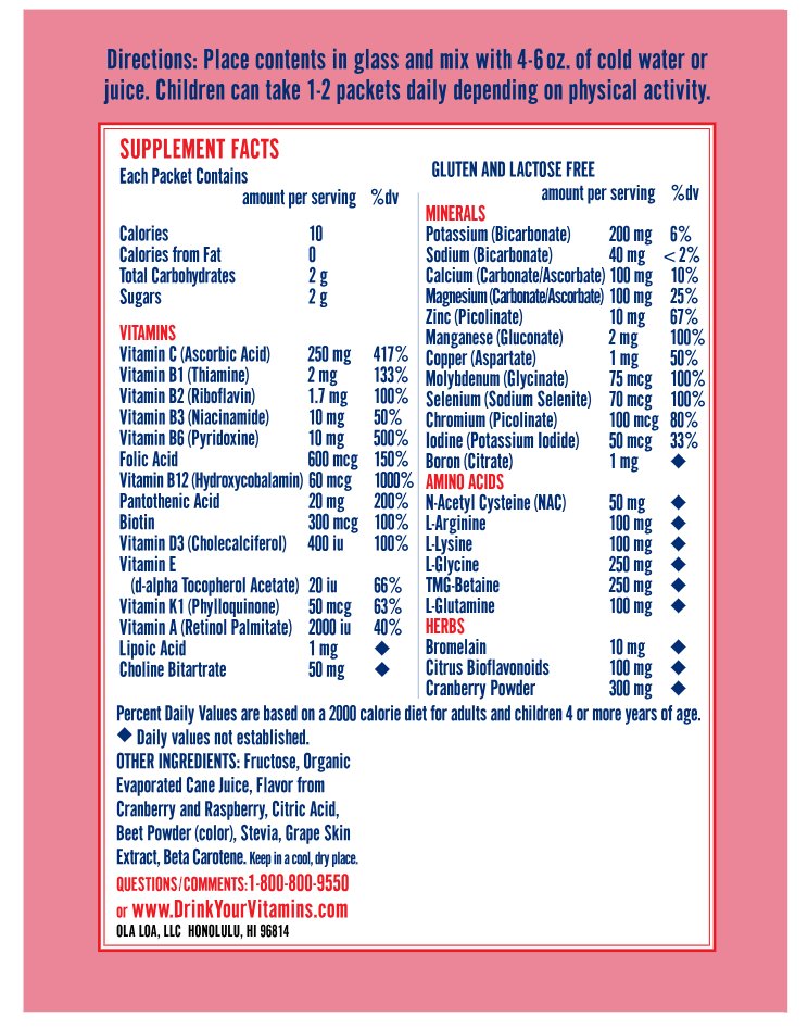Ola Loa multi vitamin drink mix is the easiest way to get your kids to take their daily multi vitamin. Just add the contents of the single serving packet to a 4-6 oz. glass of cold water or juice, and your kids can drink their vitamins. Kids love the yummy Cran Raspberry flavor, and don’t be surprised if they ask for more!