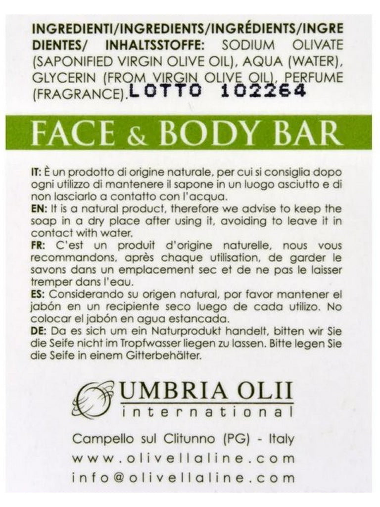 Sodium Olivate (Saponified Virgin Olive Oil), Aqua (Water), Glycerin (From Virgin Olive Oil), Perfrume (Fragrance)