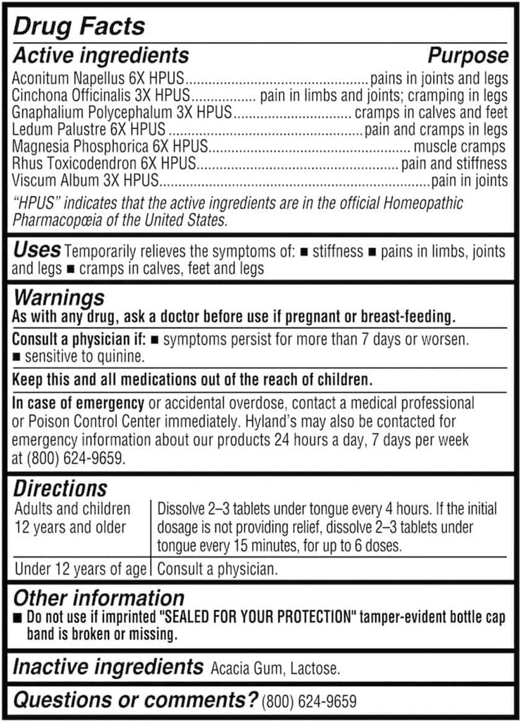 Hyland's Leg Cramps tablets helps temporarily relieve leg, calf, and foot cramps. Our formulas are made with natural active ingredients and contain no aspirin, acetaminophen, ibuprofen, or naproxen. There are no known side-effects and no conflicts with other medications you may be taking.