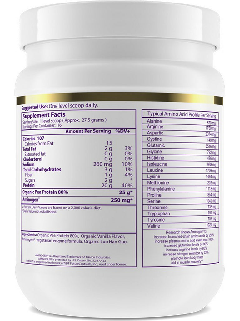 Paradise Pea Protein is a complete source of vegan, hypo-allergenic protein derived from certified organic pea. Pea protein is easily assimilated and has a sustained release transit time, which means it has excellent digestibility and keeps working. We have further enhanced our formula with the addition of the plant derived enzyme Aminogen®. Research shows Aminogen® increases branched-chain amino acids by 250%, plasma amino acid levels over 100%, glutamine levels by 90%, arginine levels by 80%, and nitrogen retention by 32%. It also promotes lean body mass, aids in muscle recovery, and may provide less gas, bloating and constipation.