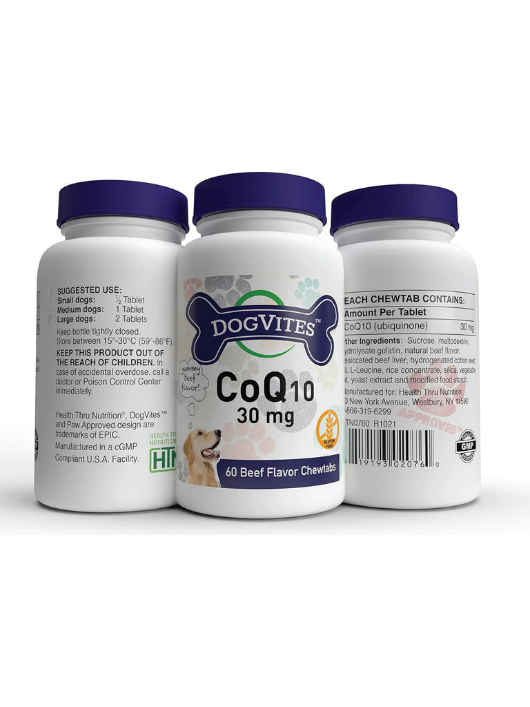 Health Thru Nutrition Dog-Vites CoQ10 for Dogs is a dietary supplement in the form of beef-flavored chewable tablets. Each tablet contains 30mg of Coenzyme Q10 (CoQ10), a natural substance found in every cell of the body that plays a key role in energy production and antioxidant defense.