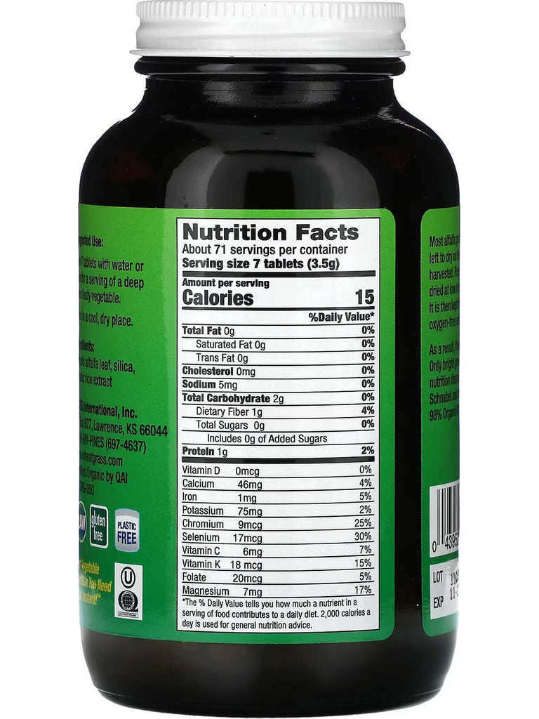 Revered as the "father of all foods," our alfalfa tablets are packed with essential minerals and vitamins, making them a must-have for anyone seeking a natural boost. Grown and packaged with meticulous care, our alfalfa stands out with its vibrant dark green color.