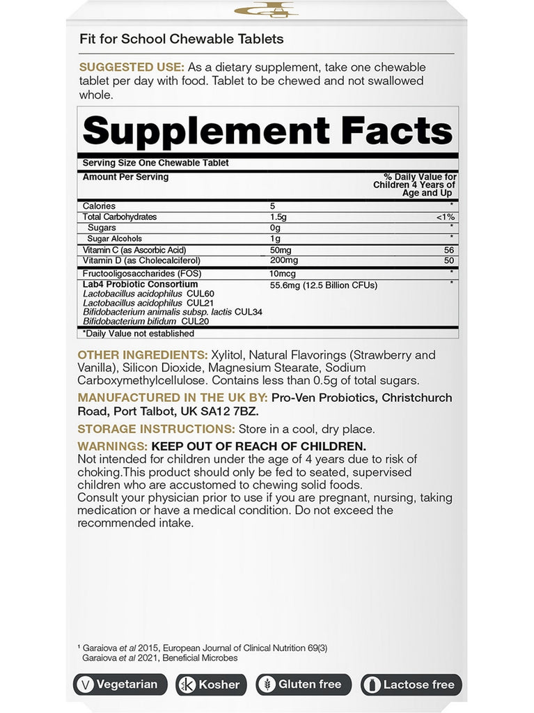 ProVen Probiotics Fit for School chewable tablets has been specially formulated for children aged 4-16 years old. Each tablet contains 12.5 billion of the unique Lab4 probiotics combined with vitamin C specifically to provide support for your child’s immune function (as well as providing digestive support and all the other benefits of a probiotic).