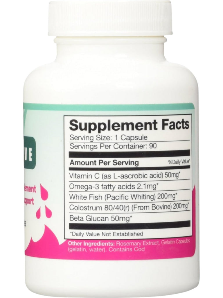 SeaVive ingredients: Seacure supports healthy immune function at the gut level by providing bioactive peptides and biogenic amines from hydrolyzed white fish that promote structural integrity and function of the intestinal mucosa. Colostrum 80/40 supplies immune factors to the intestinal lining and support normal immune function at the gut level. The Beta glucan supports the immune system. Vitamin C is recognized by its immune support.