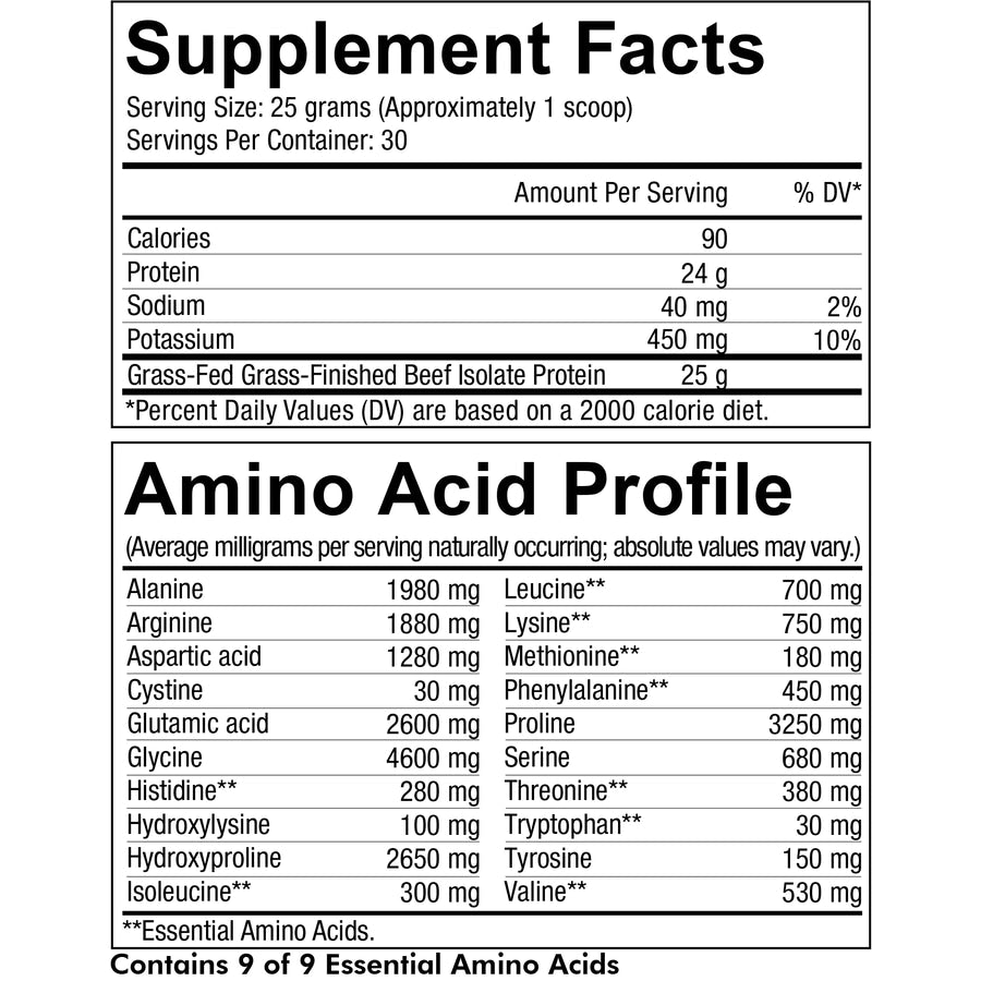 - This grass-fed beef isolate protein powder offers 20 amino acids, including all 9 essential amino acids, delivering a modern BCAA & EAA supplement and a comprehensive protein profile for your health and wellness.