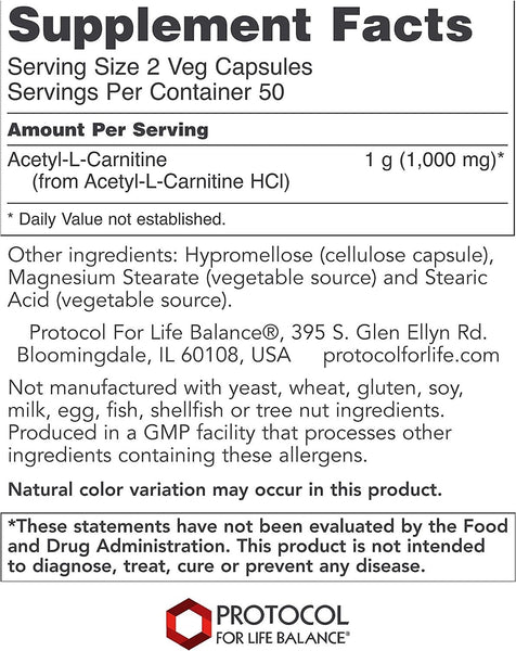 Protocol For Life Balance, Acetyl-L-Carnitine, 500 mg, 100 Veg Capsules