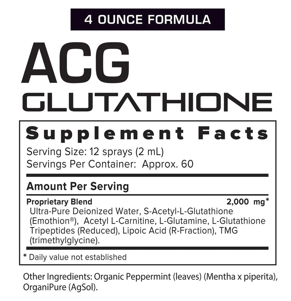 Ultra-Pure Deionized Water, S-Acetyl-L-Glutathione, Acetyl L-Carnitine, L-Glutamine, L-Glutathione Tripeptides (Reduced), Lipoic Acid (R-Fraction), TMG (trimethylglycine).