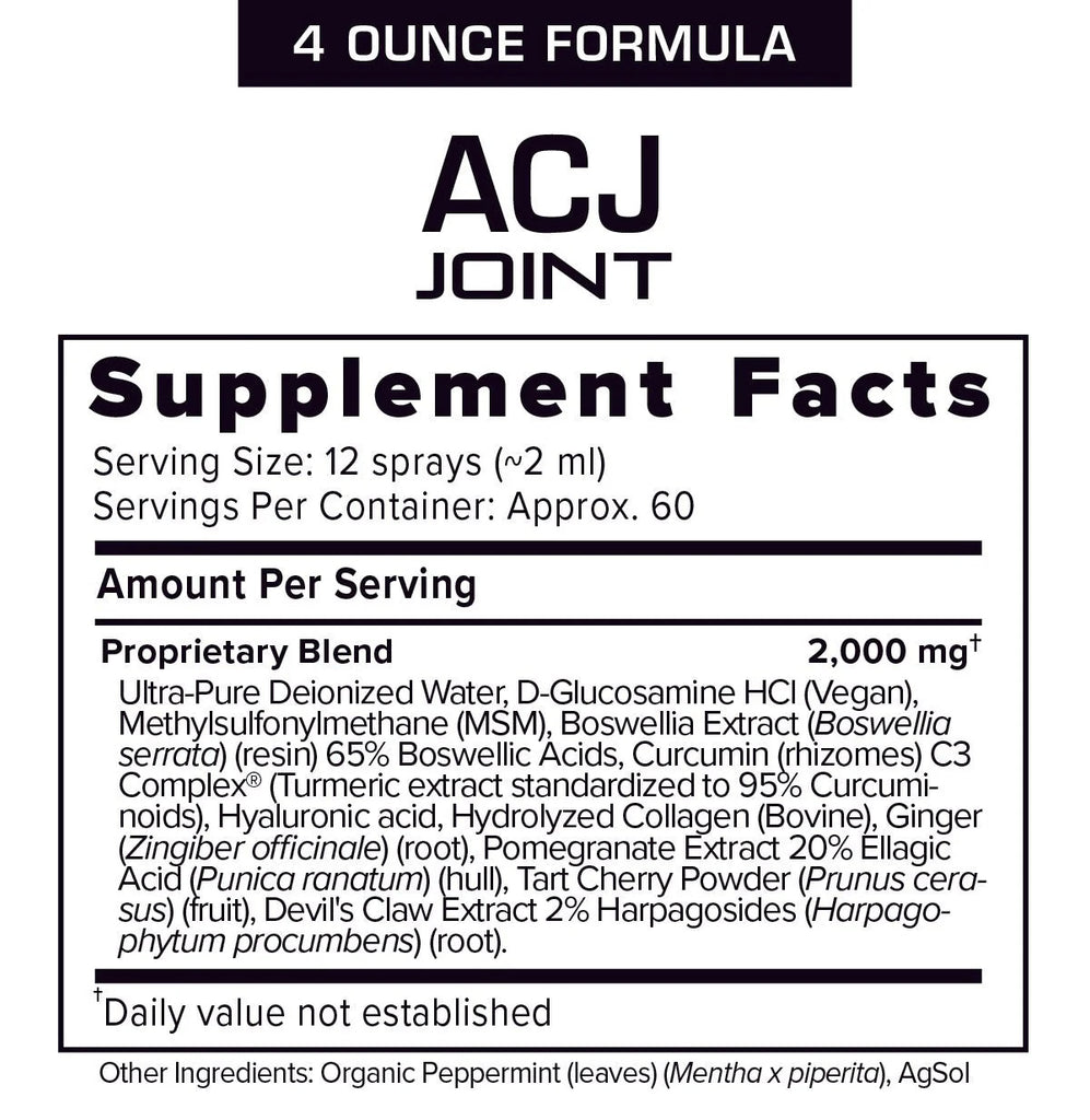 Nourish joints and muscles with a synergistic blend of clinically proven ingredients such as Hyaluronic acid, Collagen, Curcumin & Glucosamine formulated in a simple to take Intra-oral spray. Rapidly absorbed ACJ Joint Extra Strength provides discernable results with daily use.