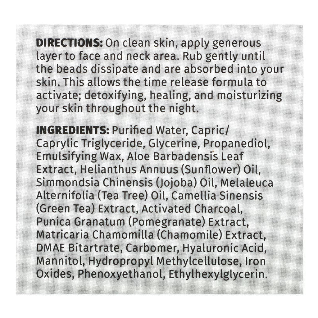 On clean skin, apply generous layer to face and neck area. Rub gently until the beads dissipate and are absorbed into your skin. This allows the time release formula to activate; detoxifying, healing, and moisturizing your skin throughout the night.
