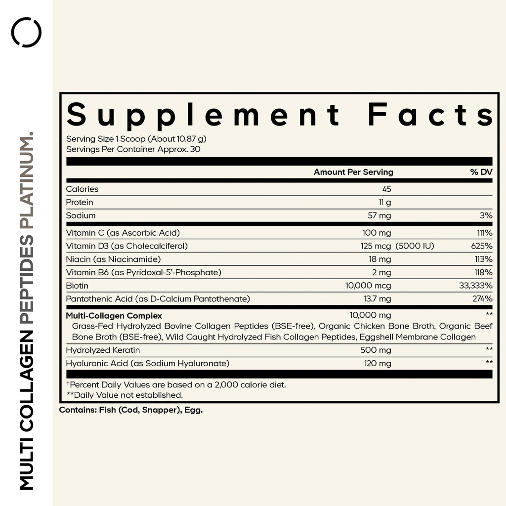 Codeage Multi Collagen Platinum is a high-quality collagen powder supplement that offers 5 types of collagen peptides, biotin 10,000 mcg, hydrolyzed keratin, hyaluronic acid, niacin, and various vitamins and amino acids all-in-one.