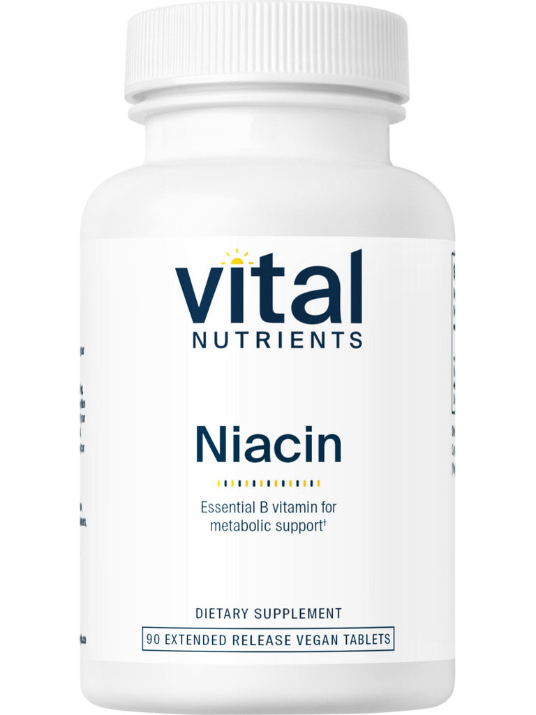 Niacin 500mg Extended Release tablets contain Niacin (vitamin B3), a water soluble vitamin with an important role in cellular metabolism.* Niacin has a very long history of clinical use in supporting cardiovascular health and has been shown to support lipid metabolism, Cholesterol, LDL, Lipoprotein (a) and HDL. Niacin has an impressive record of nutritional supportive effects on cholesterol metabolism that are documented in numerous clinical trials. Clinical studies also suggest niacin may also support the peripheral circulatory system and healthy fibrinogen production. Vital Nutrients Niacin 500mg Extended Release Tablets contain a time-release matrix that slowly secretes niacin into the body. Clinical trials have demonstrated bioavailability and tolerance of Vital Nutrients extended release Niacin. 1500 mg per day supports lipid metabolism.