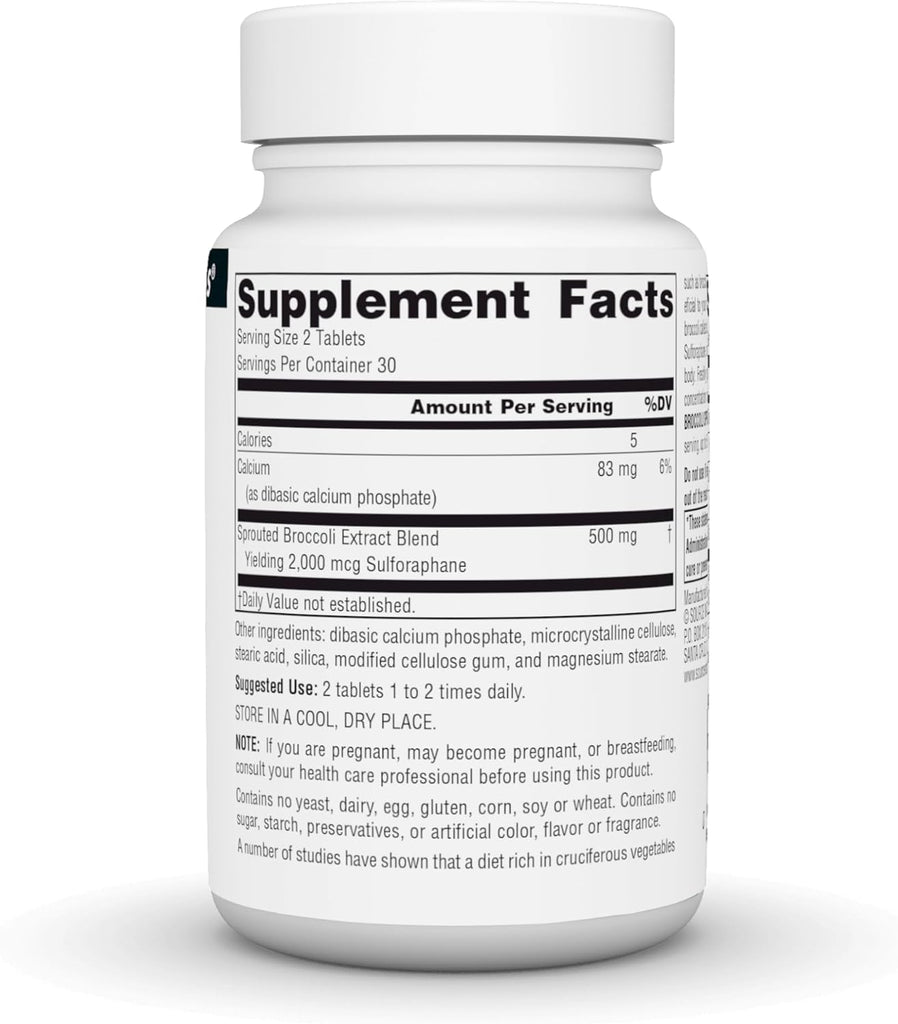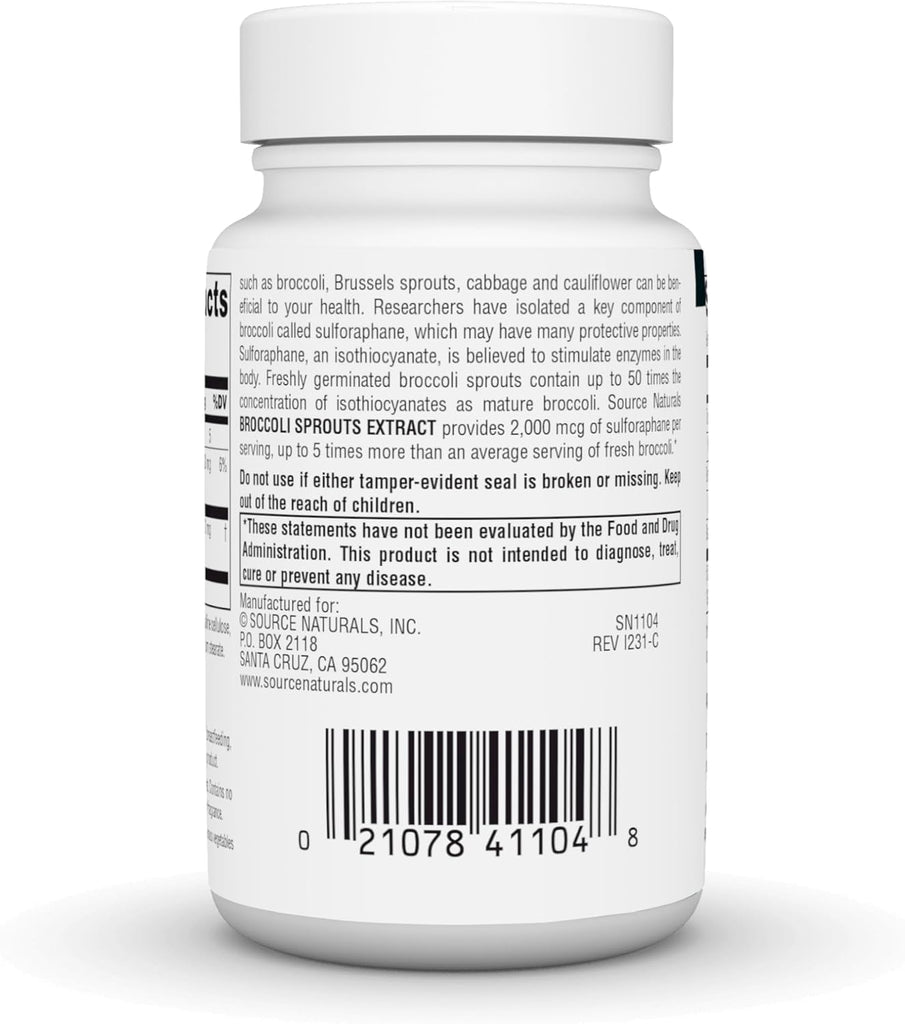 A number of studies have shown that a diet rich in cruciferous vegetables such as broccoli, Brussels sprouts, cabbage, and cauliflower can be beneficial to your health. Researchers have isolated a key component of broccoli called sulforaphane, which may have many protective properties. Sulphoraphane, an isothiocyanate, is believed to stimulate enzymes in the body. Freshly germinated broccoli sprouts contain from 30 to 50 times the concentration of isothiocyanates as mature broccoli. Source Naturals Broccoli Sprouts Extract provides 2,000 mcg of sulforaphane daily, equivalent to eating more than a pound of fresh broccoli.