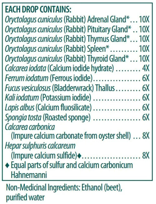 In addition, this homeopathic thyroid supplement also provides rabbit adrenal gland‚ spleen‚ pituitary gland‚ and thyroid gland. These - along with two forms of calcium - may provide further support for an underactive thyroid‚ since the thyroid gland is responsible for regulating the entire glandular system.
