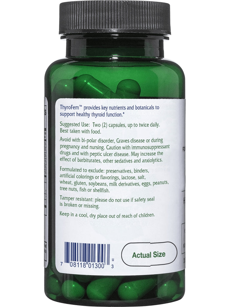 ThyroFem combines specific key nutrients promoting normal, healthy thyroid function and production of thyroid hormone. Select herbs provide traditional thyroid support and balanced polyglandular support with the entire endocrine system.