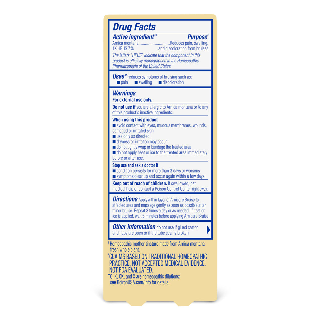 Apply a thin layer of Arnicare Bruise Gel to affected area and massage gently as soon as possible after minor bruise. Repeat 3 times a day or as needed.