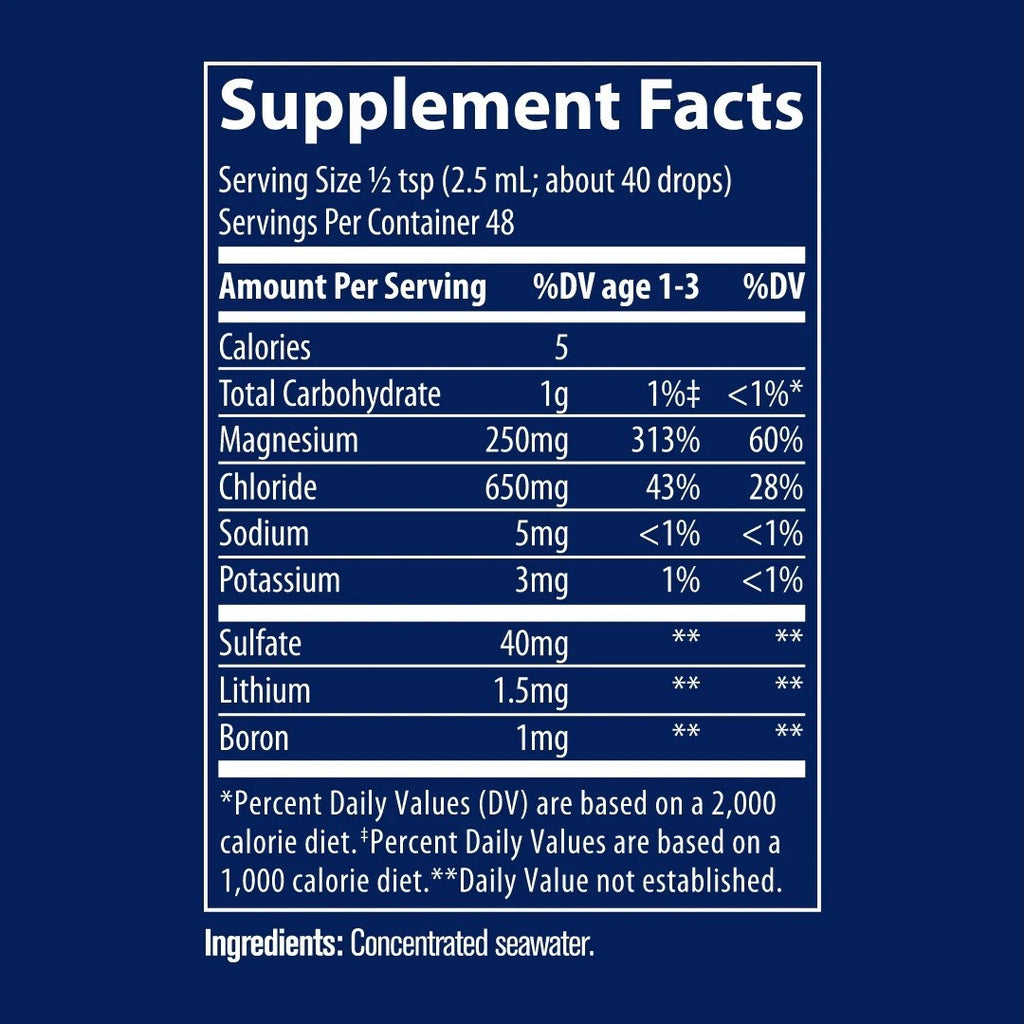 This product is all natural, highly concentrated, contains no added preservatives, flavors, or sweeteners and has a very strong taste. We recommend mixing it with juice or food and dividing the serving throughout the day to mask the concentrated mineral flavor. Begin regimen by taking 10 drops for 3 consecutive days. Each day thereafter, increase serving by 10 drops up to ½ tsp. (40 drops) once or twice daily. Children age 1-3: Take 1 drop for every 5 lbs of body weight. For regular or sodium restricted diets.