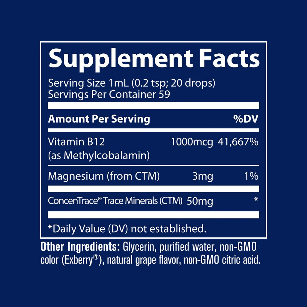 Ionic B12 provides 1,000mcg of Vitamin B12 per serving, plus a full spectrum of naturally-occurring ionic trace minerals in an ionic form. Vitamin B12 plays a crucial role in multiple metabolic functions, including enzyme production, DNA synthesis, hormone balance, and healthy nerve and cardiovascular function.† Also contains a full spectrum of concentrated ionic trace minerals.