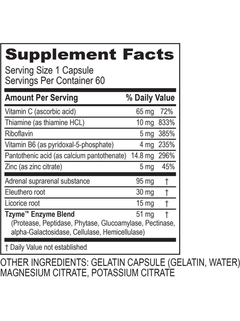 - Nutritional Support. This safe and effective supplement contains specific vitamins and minerals essential for energy and hormone production in the adrenals and includes the herbs eleuthero and licorice root to support healthy adrenal function plus an enzyme blend for effective delivery of these ingredients.