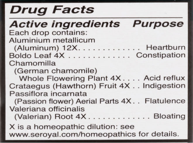 German chamomile may help alleviate mild digestive discomfort, gas, or diarrhea. In addition, valerian root may work to relax smooth muscles, such those found in the digestive tract. Finally, the passionflower extract in Unda #24 homeopathic liquid might help regulate contractions in the intestines and potentially alleviate mild symptoms of abdominal pain.
