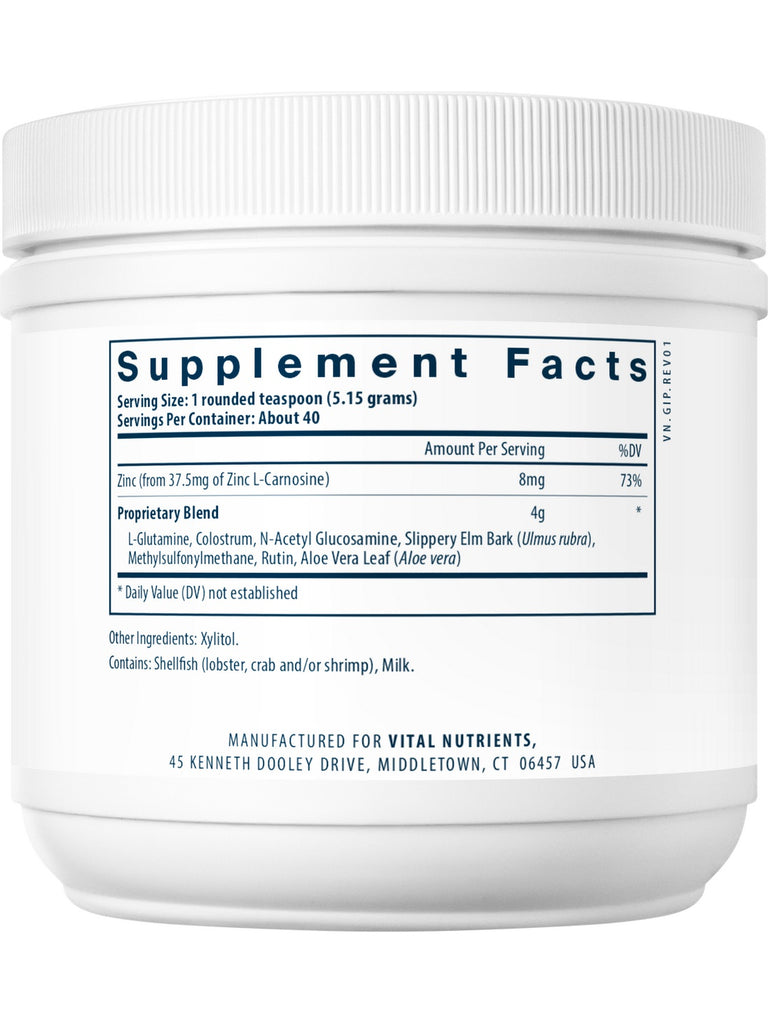GI Repair Powder is a comprehensive proprietary blend that helps maintain a healthy intestinal lining and normal permeability. This gentle supplement has a beneficial effect on intestinal mucosal integrity by combining ingredients to provide fuel, protection, and structural support for intestinal mucosal cells. This exclusive combination includes Slippery Elm Bark Powder to help comfort and soothe the GI tract. GI Repair Powder also supports and promotes collagen repair. This soothing, palatable powder has a neutral taste, readily dissolves in water and is easily digested.