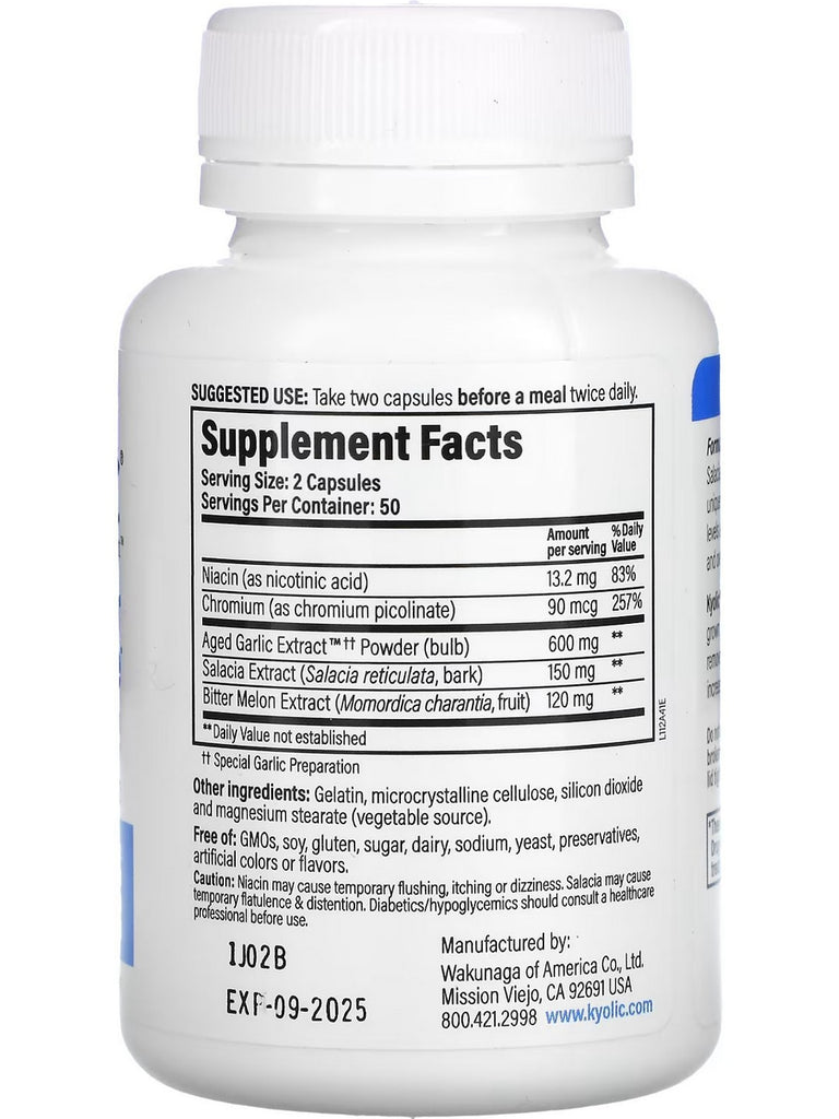 Kyolic Aged Garlic Extract Blood Sugar Balance Formula contains 600 mg of AGE and a unique combination of Salacia and Bitter Melon extracts along with Niacin and Chromium Picolinate per serving. This synergistic blend naturally supports healthy blood sugar levels, already within normal ranges, aids in weight management, as well as cardiovascular and immune health for overall well-being.