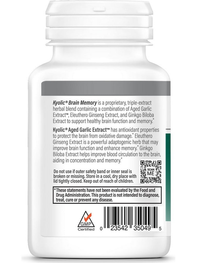 Kyolic Brain Memory is a proprietary, triple-extract herbal blend containing a combination of Aged Garlic Extract, Ginseng Extract and Ginkgo Biloba Extract to support healthy brain function and memory.