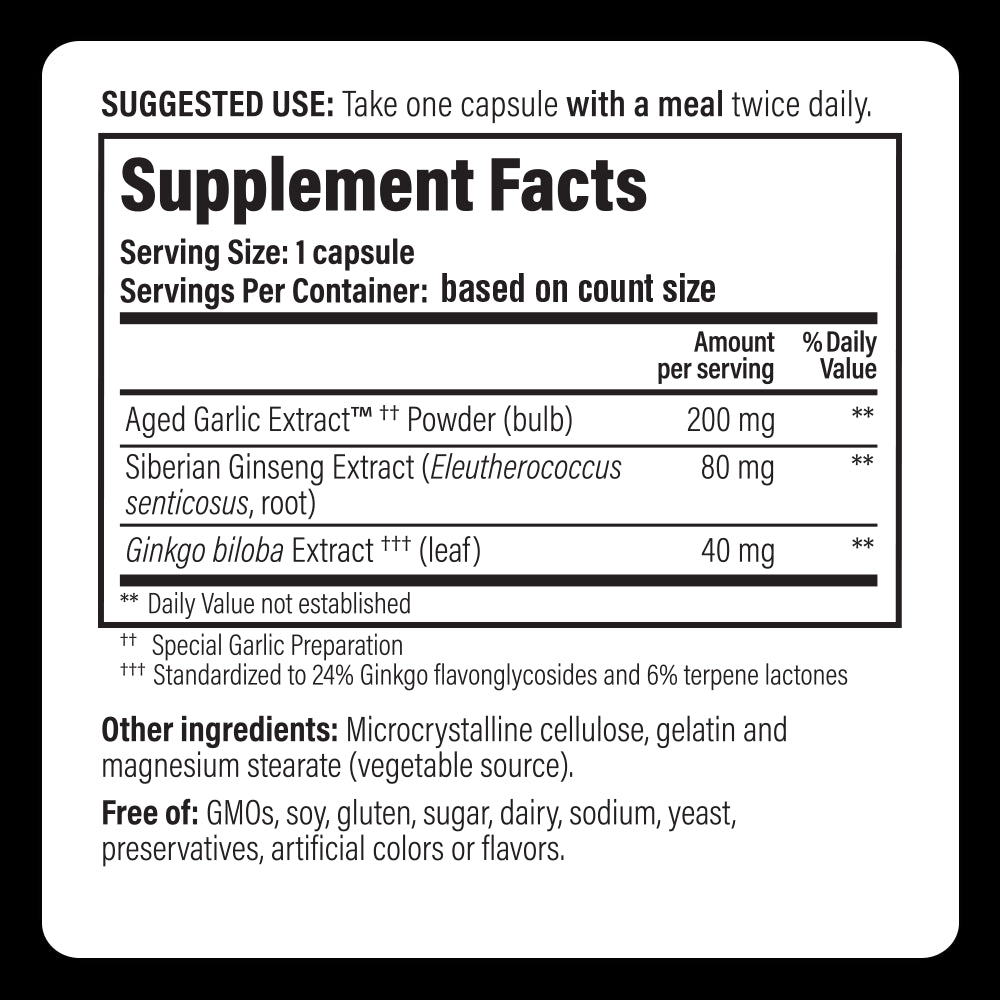Aged Garlic Extract is a powerful antioxidant that can help support learning and protect the brain from oxidative damage. Eleuthero Ginseng Extract is a powerful adaptogenic herb that may improve brain function and enhance memory. Ginkgo Biloba Extract helps improve blood circulation to the brain, aiding in concentration and memory.
