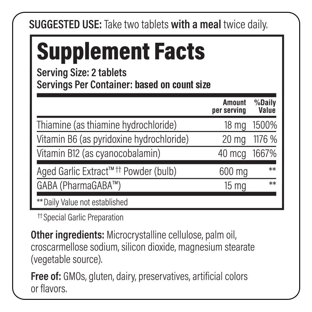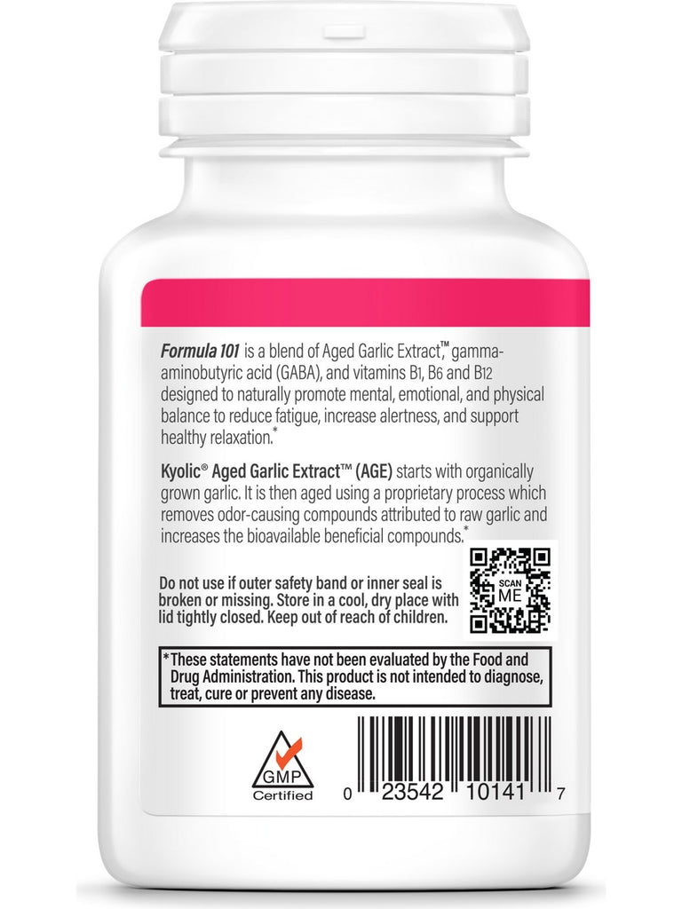 Kyolic Aged Garlic Extract Formula 101 Stress & Fatigue Relief contains 600 mg of Aged Garlic Extract, along with 15 mg of GABA, Vitamins B1, B6, and B12. Take Formula 101 daily to support mental, emotional and physical balance, reduce fatigue and stress.