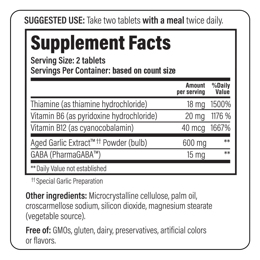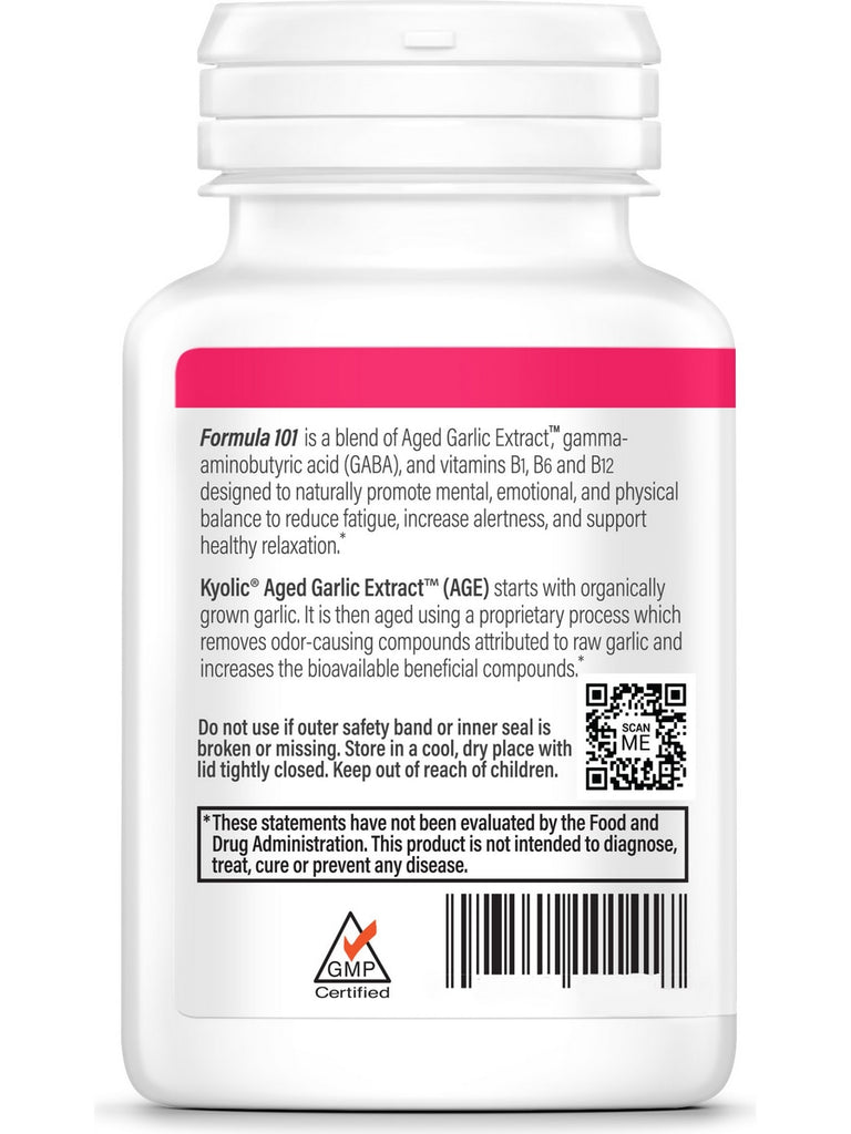 Kyolic Aged Garlic Extract Formula 101 Stress & Fatigue Relief contains 600 mg of Aged Garlic Extract, along with 15 mg of GABA, Vitamins B1, B6, and B12. (2 tablets/capsules; Recommend two servings per day) Take Formula 101 daily to support mental, emotional and physical balance, reduce fatigue and stress.