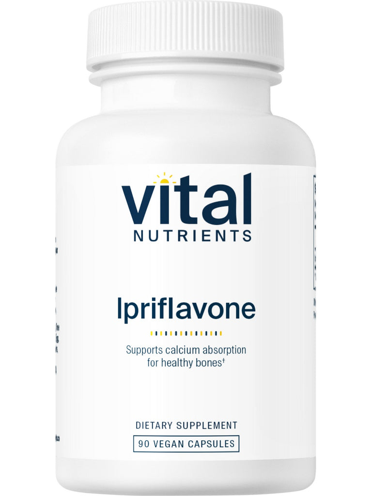 Ipriflavone is a derivative of the soy isoflavone daidzein, used to support bone health. Ipriflavone promotes the secretion of calcitonin from the thyroid, which helps maintain a normal balance of osteoclastic (bone resorption) activity in the bones as they undergo continuous remodeling. Ipriflavone also helps support calcium absorption in the intestines and promote bone mineralization.