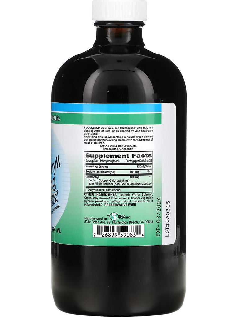 World Organic, Chlorophyll from Alfalfa, Liquid Chlorophyll with Spearmint and Glycerin, 100 mg, 16 fl oz